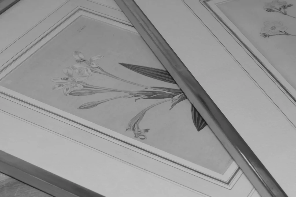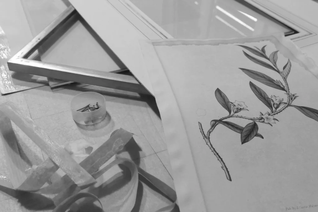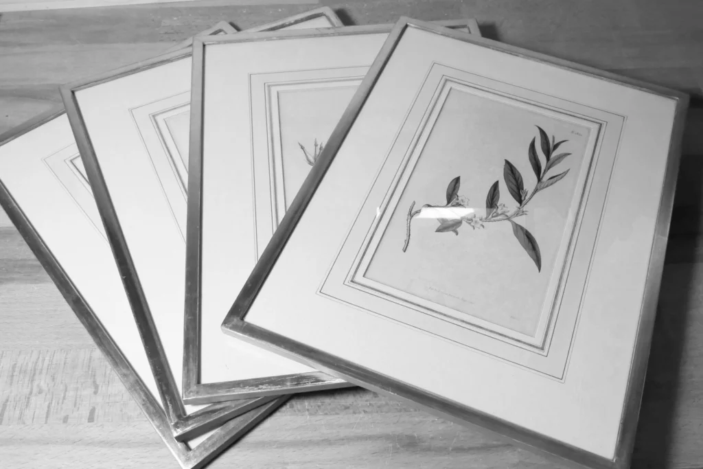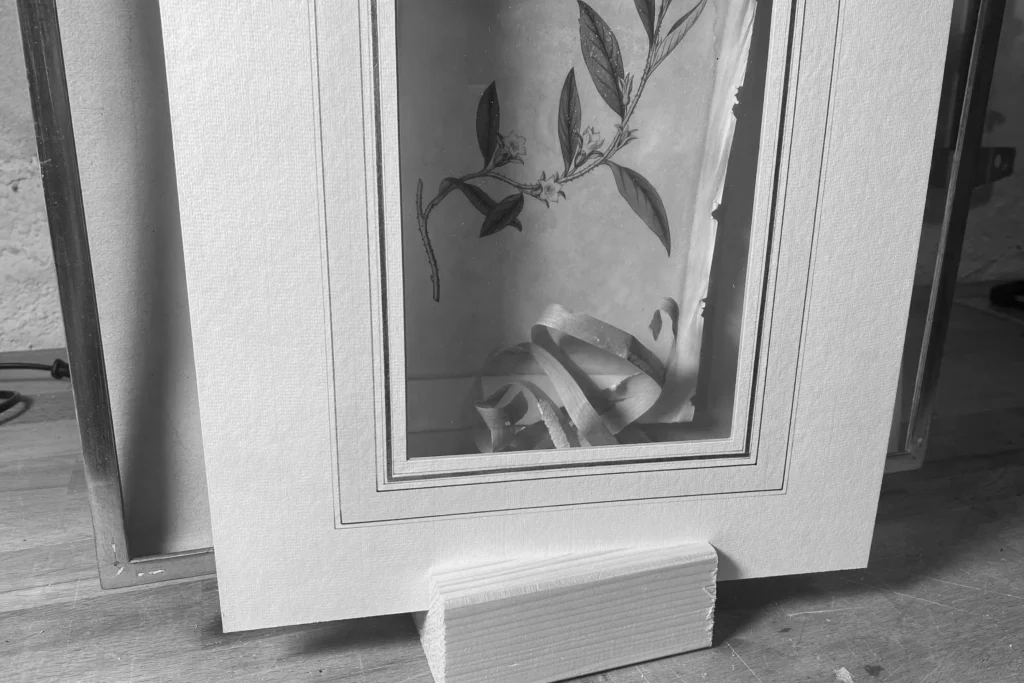 Ein komplett zerlegter Bilderrahmen mit Blumenbild neu und wiederum komplett zusammengesetzt und auf einen Sockel gestellt.
