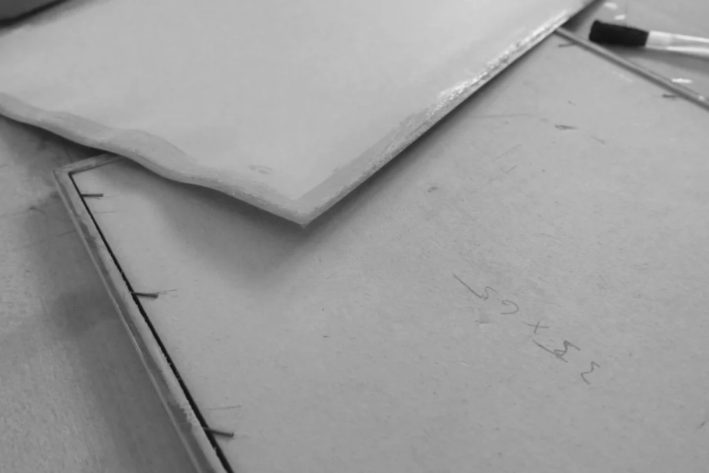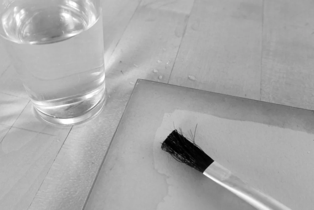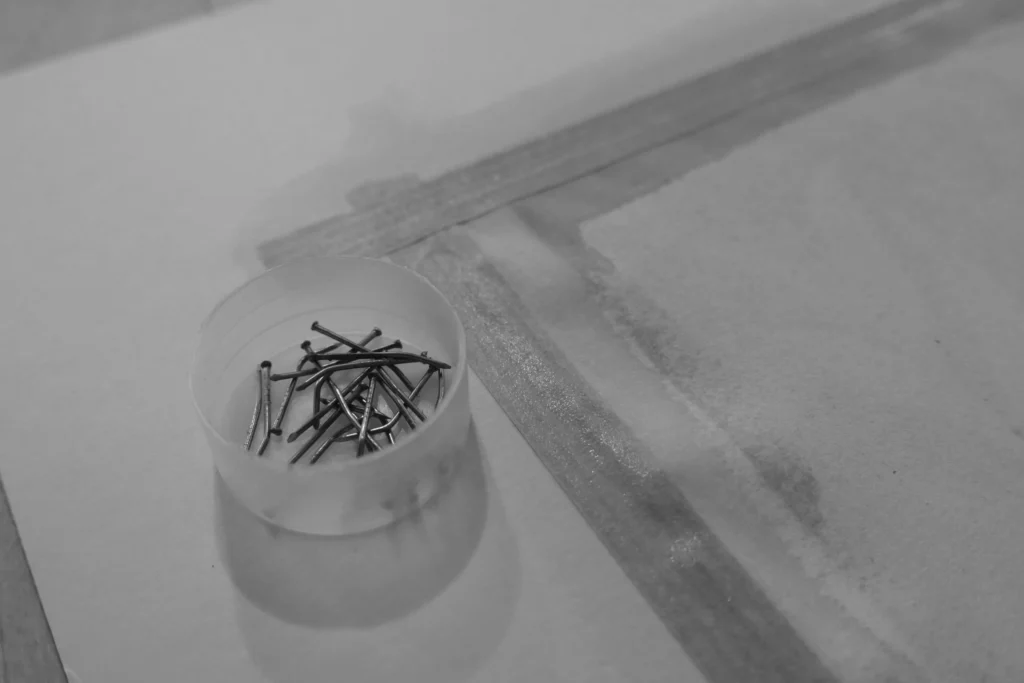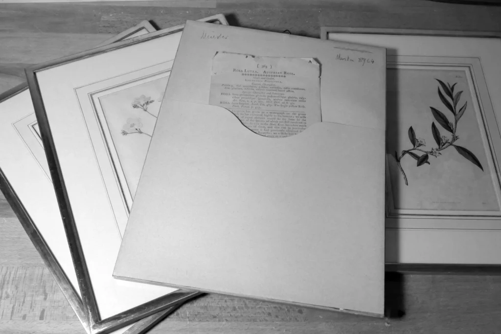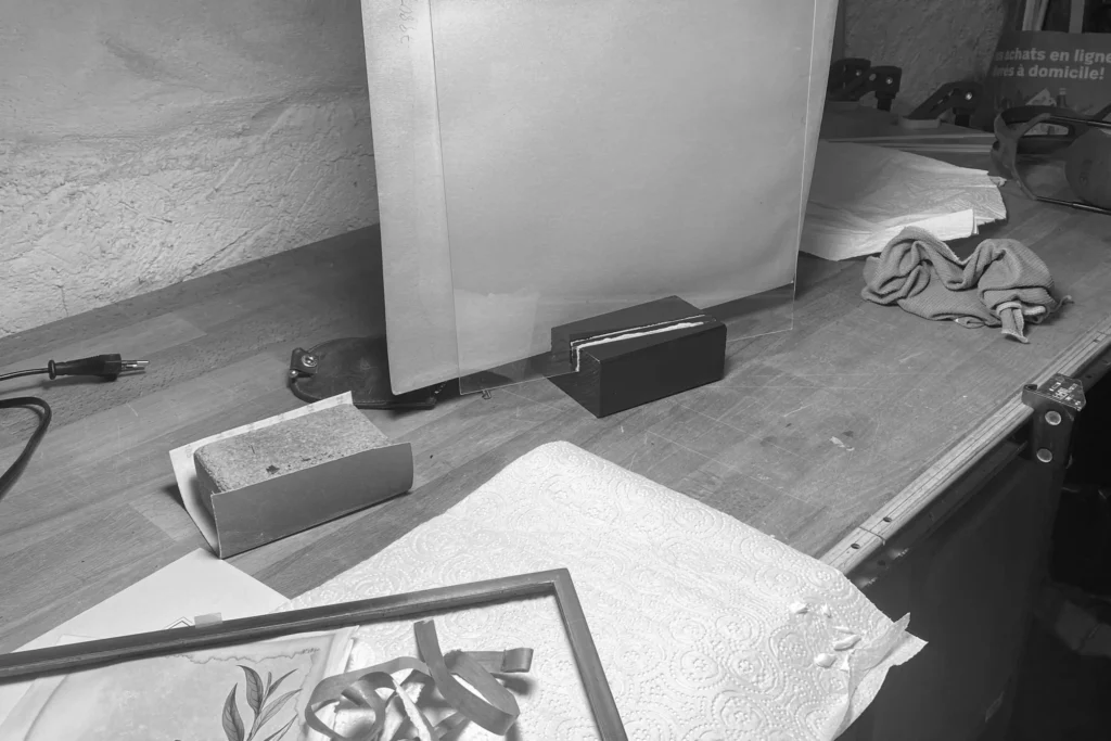 Ein komplett zerlegter Bilderrahmen mit Blumenbild neu und wiederum komplett zusammengesetzt und auf einen Sockel gestellt.